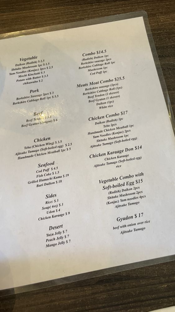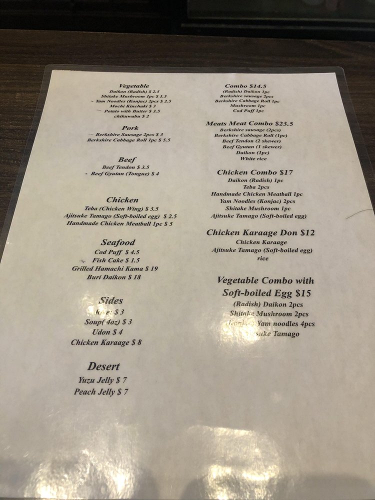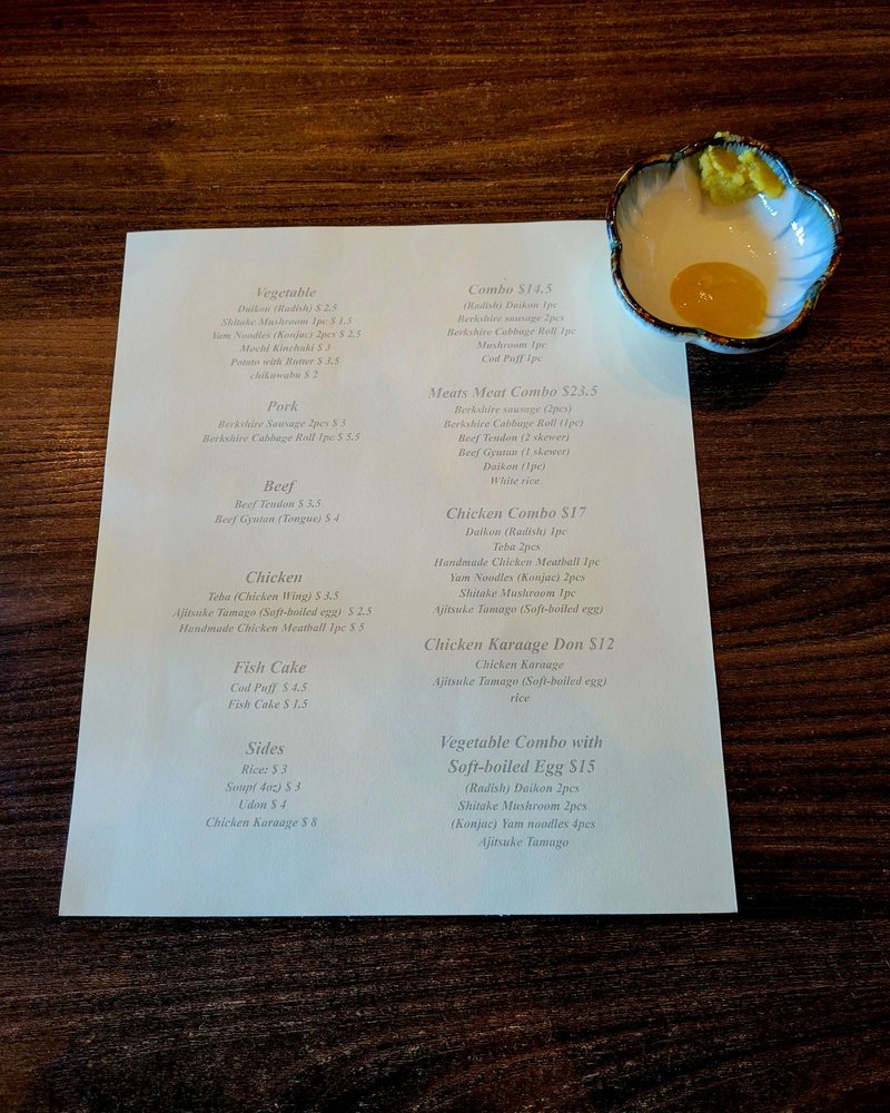 Daikon 1pcHandmade Chicken meatball Yam Noodles (Konjac) 2pcsShitake Mushroom 1pcAjitsuken Tamago (Soft-boiled egg)